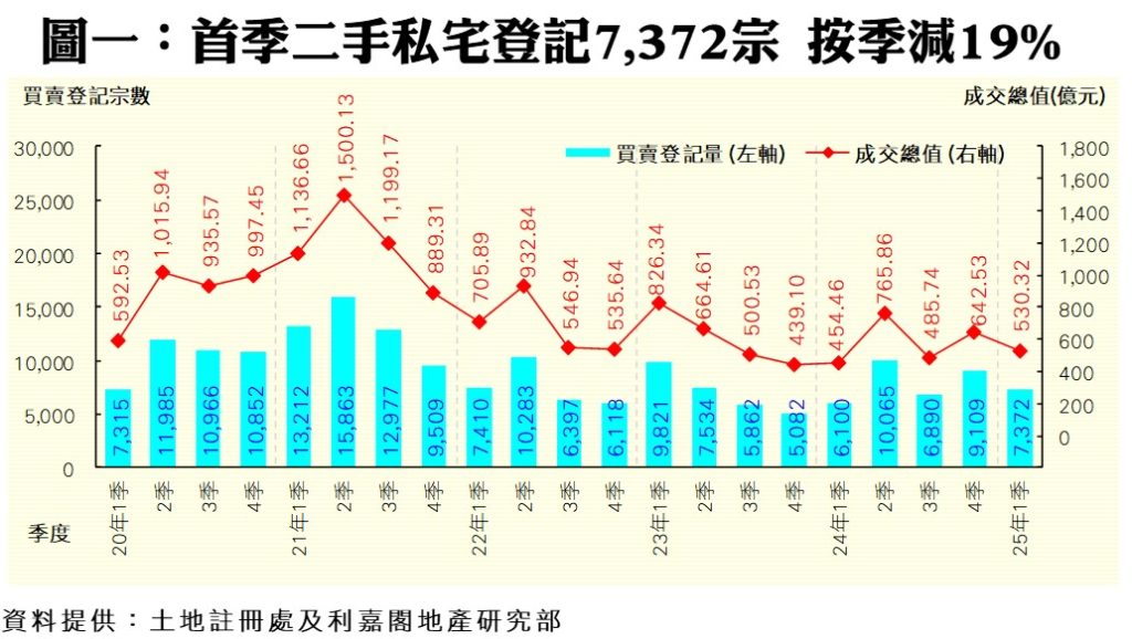 利嘉閣地產研究部主管陳海潮表示,放寬100元印花稅至樓價400萬元住宅,加上之前積聚的購買力趁樓價低水而持續釋放,二手市場登記量料在次季向好,有機會創下四季最多。根據土地註冊處最新數據,2025年第一季全港共錄7,372宗二手私宅買賣登記,較去年第四季的9,109宗下跌19%,連續5季處於反覆波動的狀態。成交總值方面,受累樓價偏軟,第一季按季相應回落17%,錄530.32億元,同為連續5季表現波動。今年首季每宗平均售價719.37萬元,按季微升1.98%,惟仍屬2016年第四季以來的34季第3低。
