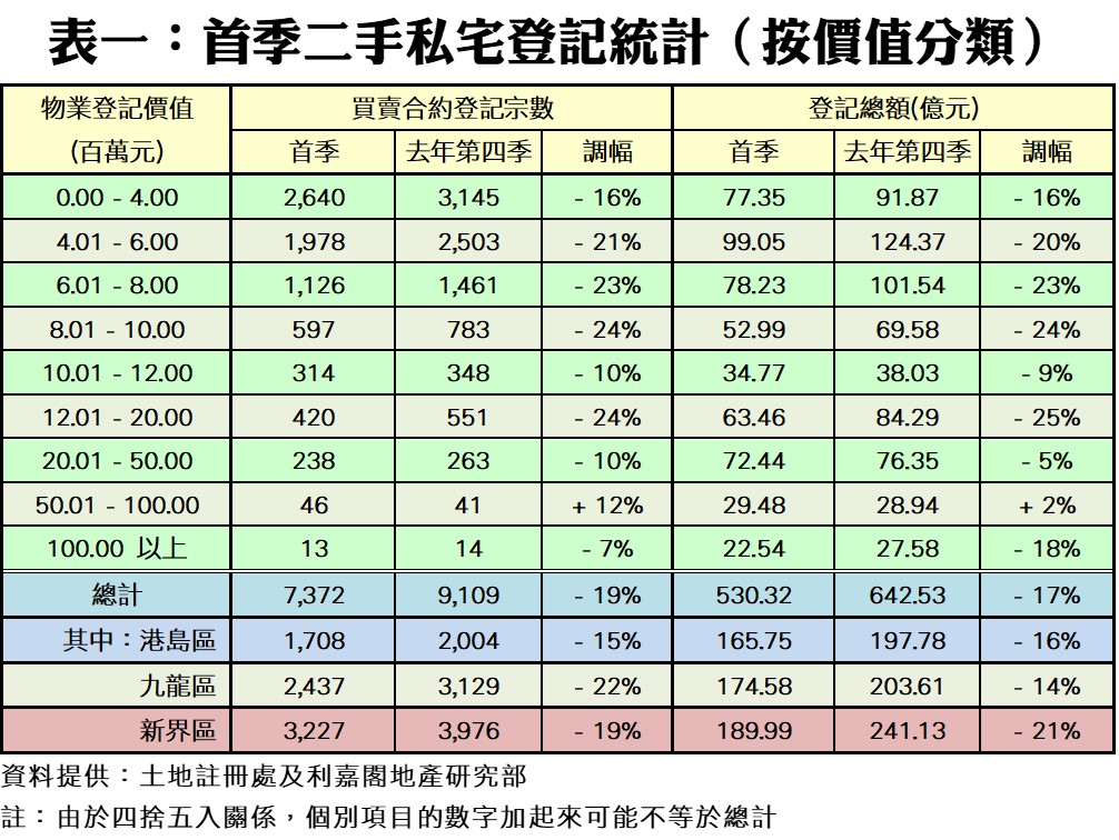 按樓價劃分,今年首季在9個樓價組別當中,錄得八跌一升,當中以樓價介乎1,201至2,000萬元者錄得最大跌幅(見表一),季內有420宗買賣登記,按季跌24%;而801萬至1,000萬元及601萬至800萬元以內兩個樓價組別亦分別跌24%及23%,各錄597宗及1,126宗登記,反映中細價物業在逆市中有所受壓。至於登記量最多的400萬元以下樓價組別,按季也跌16%,共錄得2,640宗登記。