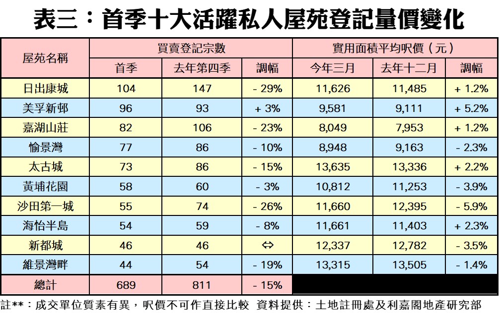 按屋苑劃分,今年首季十大活躍成交屋苑買賣登記量錄得八跌、一平、一上升,合共錄689宗登記,按季減少15%。季內登記量跌幅最大的屋苑為日出康城,共錄104宗登記,按季大減29%;其次沙田第一城及嘉湖山莊亦各挫26%及23%,各自錄得55宗及82宗登記。至於日出康城則以逾百宗(104宗)登記力壓美孚新村(96宗),蟬聯首季最熱賣屋苑龍頭地位。