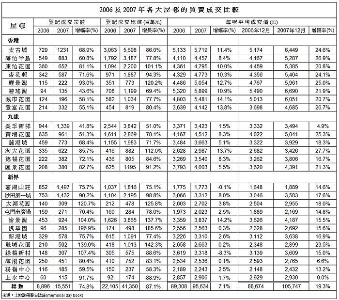2007年整體住宅樓宇買賣合約共錄得123,575宗成交及4,340.3億元成交金額,前者較2006年升49.8%,並創1997年172,711宗以來的新高,後者則較2006年升87.1%,創1997年6,903.4億元以來的新高。