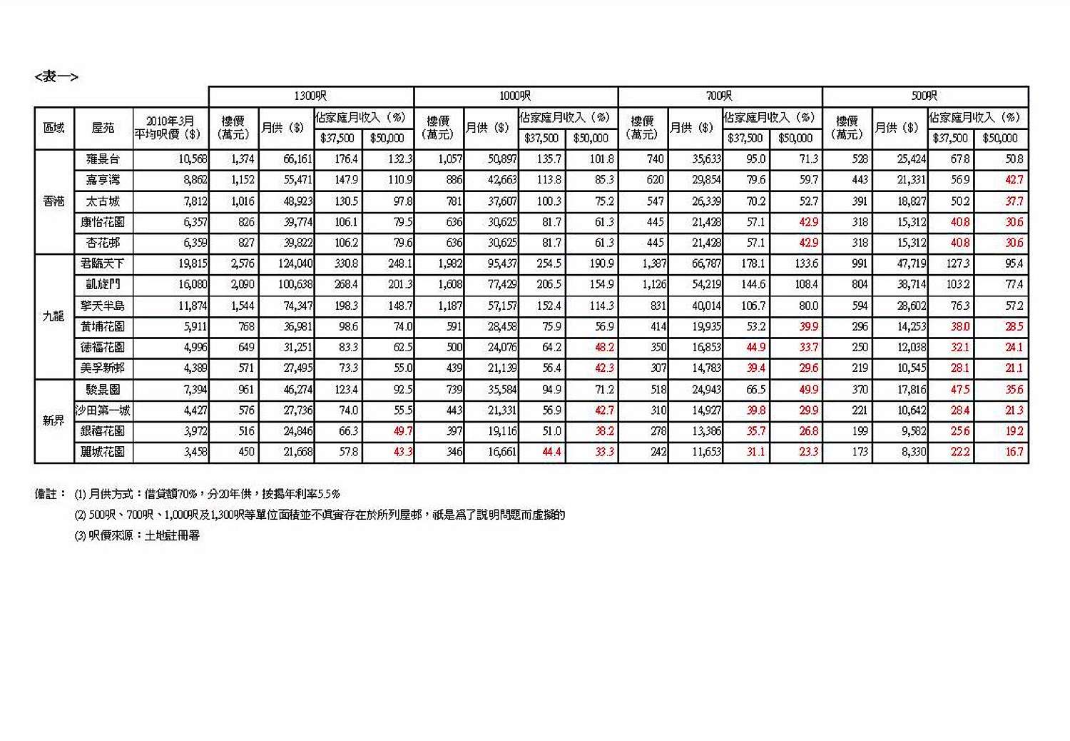 市民目前的供樓負擔比率不足四成,這種說法有很大的誤導成份!為甚麼說它誤導?因為這個比率是建基於空前超低的按揭利率上的。人無近憂,必有遠慮,供樓是一個20至30年的作戰計劃。目前超低的按揭利率(2.1%或以下)是一個數十年難得一見的特例,絕非常態,現時供得綽綽有餘,說不定三、四年後,因為利率上升而捉襟見肘。如果我們以過去25年的平均按揭利率5.5%去計算月供,一個截然不同的處境將告出現。以家庭月收入中位數($17,500)去驗定市民的供樓能力,無泡沫派可能不服,我們且看看中產階層屆時的供樓能力會怎樣。根據民間團體「中產動力」定義,在港家庭月入$25,000至$50,000為中產階層。從表一資料看到,在5.5%按揭利率及月供不可超過收入50%的條件下,月入$37,500的家庭(中產收入中位數)僅可購買500呎的康怡花園、杏花邨、駿景園及其他呎價在$6,357以下的屋苑單位,700呎的德福花園、美孚新邨、沙田第一城及其他呎價在$4,427以下的屋苑單位,和1,000呎的麗城花園。月入$50,000(中產收入的高位數)的家庭僅可購買500呎的嘉亨灣、太古城及其他呎價在$7,812以下的屋苑單位,700呎的康怡花園、杏花邨、駿景園和其他呎價在$6,357以下的屋苑單位,1,000呎的德福花園、美孚新邨、沙田第一城和其他呎價在$4,389以下的屋苑單位,以及1,300呎的銀禧花園和麗城花園。