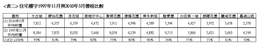 97年的樓價,是空前的資產大泡沫下的產物,大泡沬樓價的80%(亦即目前普羅大眾會購買的住宅平均樓價),不等於這個價格沒有泡沫。與現時比較,97年香港的整體經濟更好,不說別的,過去13年港人的實質平均工資不進反退(目前祇為97年的94%),更值得注意的,當比較97年與現時相同物業的樓價,我們得將物業折舊的因素考慮在內。經過13年的風吹雨打,現時的物業較97年相同的老了這麼多年,價格大抵總有20%折舊吧。果如此,中下價樓目下的價格已與97年相同物業的並駕齊驅,甚至有過之而無不及。以表二資料為例,太古城、康怡花園、香港仔中心及美孚新邨,它們的呎價其實已超過97年的,太古城尤其如此。經濟大不如前、工資倒退及折舊三個因素加起來,現時中下價樓的價格,其實已明顯超越97年的大泡沫價,我們還能說現時的樓市沒有泡沫?!