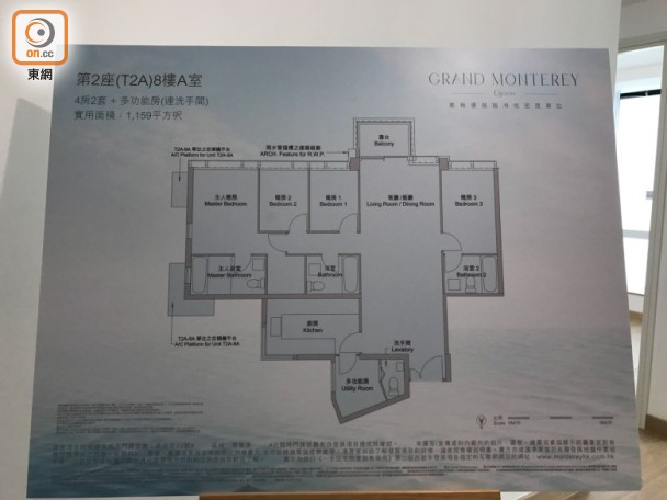 【多相】MONTEREY 四房戶 實用面積1159方呎 Published 2017-12-08 · Updated 2019-04-15 MONTEREY115901p.jpegMONTEREY115902p.jpegMONTEREY115903p.jpegMONTEREY115904p.jpegMONTEREY115905p.jpegMONTEREY115906p.jpegMONTEREY115907p.jpegMONTEREY115908p.jpegMONTEREY115909p.jpegMONTEREY115910p.jpeg 會德豐地產旗下將軍澳MONTEREY開放全新示範單位予傳媒參觀,包括一個連裝修及一個交樓標準示範單位。 其中交樓標準示範單位,參照第2座(T2A)8樓A室搭建,實用面積1,159方呎,大廳連接41方呎露台,採四房雙套間隔,另設多功能房。