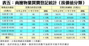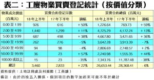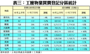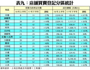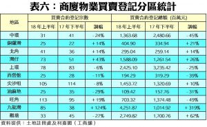 根據土地註冊處資料顯示,截至6月30日為止的上半年,全港共錄得5,290宗工廈、商廈及店舖物業買賣登記,涉及登記金額達659.15億元,較去年下半年的4,543宗及819.34億元分別上升16%及回落20%;若按年同比,則分別升19%及跌16%;量升主要受惠工廈拆售及商廈新項目推出,而登記金額回落主因是對上的半年錄得較多巨額登記所致,主要是領展出售多個商場。