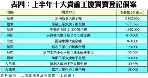從個別成交個案分析,上半年十大貴重工廈買賣登記的金額介乎1.28億元至最高的21.63億元;當中,排在榜首者為荃灣永南貨倉大廈全幢登記,涉資近21.63億元;其次為觀塘業發工業大廈2期全幢,涉資近16.22億元。在十大貴重成交中,全幢工廈成交佔了4個席位,分別分布在荃灣、觀塘及元朗,其餘6個則為全層的交易。