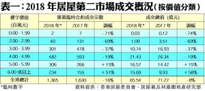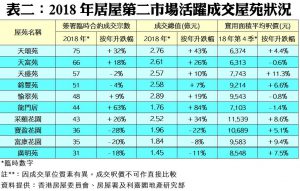 按物業價值劃分(見表一),價值500萬元以下的四個「細價」組別交投全線下跌,成交宗數跌幅介乎19%至71%不等。至於價值500萬元至599萬元以及600萬元或以上成交組別,分別錄得306宗及234宗買賣個案,較2017年逆市上升15%及51%。若按屋苑劃分(見表二),去年天水圍天頌苑共錄75宗買賣,涉及總值約2.76億元,按年分別增加32%及43%,並為上年熱賣屋苑之首。