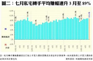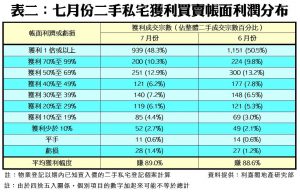數據顯示,今年七月份每宗私宅轉手個案平均賺幅為89.0%,連升三個月,按月持續微升,並創下9個月新高(見圖二)。七月份,帳面獲利1倍或以上的轉手個案佔整體二手私宅買賣比例有所回落,只達48.3%,按月跌2.2個百分點,共錄得939宗;至於帳面錄得虧損者有28宗,佔比按月增至1.4%,按月增加0.2個百分點,可見虧損個案佔比有輕微上升。