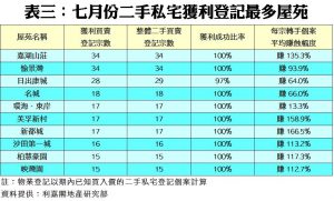 此外,環顧上月10個獲利登記最多的屋苑,當中9個均錄得百分百獲利,而每宗平均賺幅則介乎13.3%至166.5%不等。當中以新都城錄得的每宗轉手個案平均賺幅最高,達166.5%,跑贏榜首常客嘉湖山莊的135.3%。值得注意的是,榜內賺幅最低者是環海‧東岸,平均每宗只賺約13.3%,主因樓齡較新,樓價累積升幅較少(見表三)。