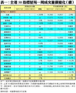 至於,九龍區21個指標屋苑上周累錄35宗買賣,按周減少1宗或3%,其中將軍澳中心及都會駅分別只得1宗成交,按周減幅各達80%及67%;新都城則錄得3宗成交,較前周的5宗減少40%;麗港城則錄得2宗交投,按周減少33%。此外,在全港50個指標屋苑當中,上周共有14個屋苑錄得「零成交」,較前周的12個增加17%,當中九龍區及新界區各佔4個及7個,港島區則佔3個(詳見表一)。
