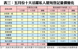 此外,上月十大活躍二手私人屋苑登記量全錄升幅,並以太古城1.4倍的升幅最大,月內有36宗登記,較四月的15宗大增;其次淘大花園亦升1.13倍,錄32宗登記。至於沙田第一城則取代嘉湖山莊成為上月最熱賣屋苑,前者增66%至58宗,後者增6%至53宗。