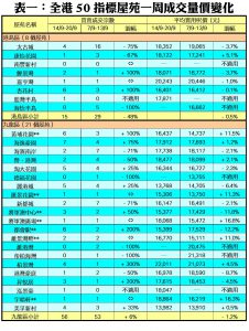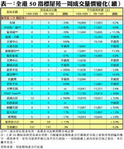 至於,新界區21個指標屋苑上周共錄66宗交投,按周增加12%,其中盈翠半島交投量按周增加2倍,上周錄得3宗成交;熱門上車屋苑沙田第一城及嘉湖山莊的成交量,亦分別按周增加60%及160%,各錄8宗及13宗交投;YOHO Town上周錄得8宗成交,較前周的6宗增加33%。此外,在全港50個指標屋苑當中,上周共有9個屋苑錄得「零成交」,較前周的8個增加13%,當中港島區及九龍區各佔2個及3個,新界區則佔4個(詳見表一)。