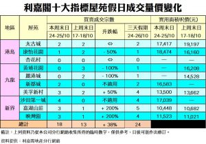 《利嘉閣十大指標屋苑假日二手實況》 一手齊推帶動二手 三日假期共錄24宗 十大屋苑周末錄18宗買賣 按周升38%