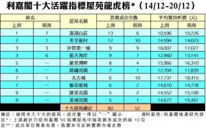 利嘉閣地產董事陳大偉表示,年尾將至,第四波疫情仍然嚴峻,近日市場都沒有焦點新盤開售,購買力回流到二手市場。加上大部分業主願意減價,買家加快入市,故上周二手交投氣氛暢旺。綜合利嘉閣地產分行數據所得,全港十大活躍指標屋苑在上周(14/12–20/12)錄80宗買賣個案,較前周(7/12–13/12)的52宗按周增加50%,平均每個屋苑錄約8宗成交。