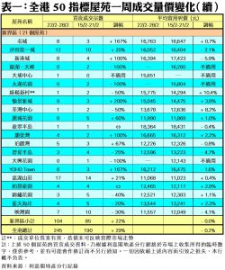至於,港島區8個指標屋苑上周共錄32宗成交,按周減少3宗或9%,其中嘉亨灣及藍灣半島上周各錄1宗買賣,按周分別減少75%及67%;鯉景灣交投量由前周的7宗,減少57%至上周的3宗;藍籌屋苑太古城成交量按周減少9%,上周共錄10宗成交。此外,在全港50個指標屋苑當中,上周共有4個屋苑錄得「零成交」,較前周的5個減少20%,當中九龍區及新界區各佔1個及3個,港島區則全線屋苑均有錄得成交(詳見表一)。