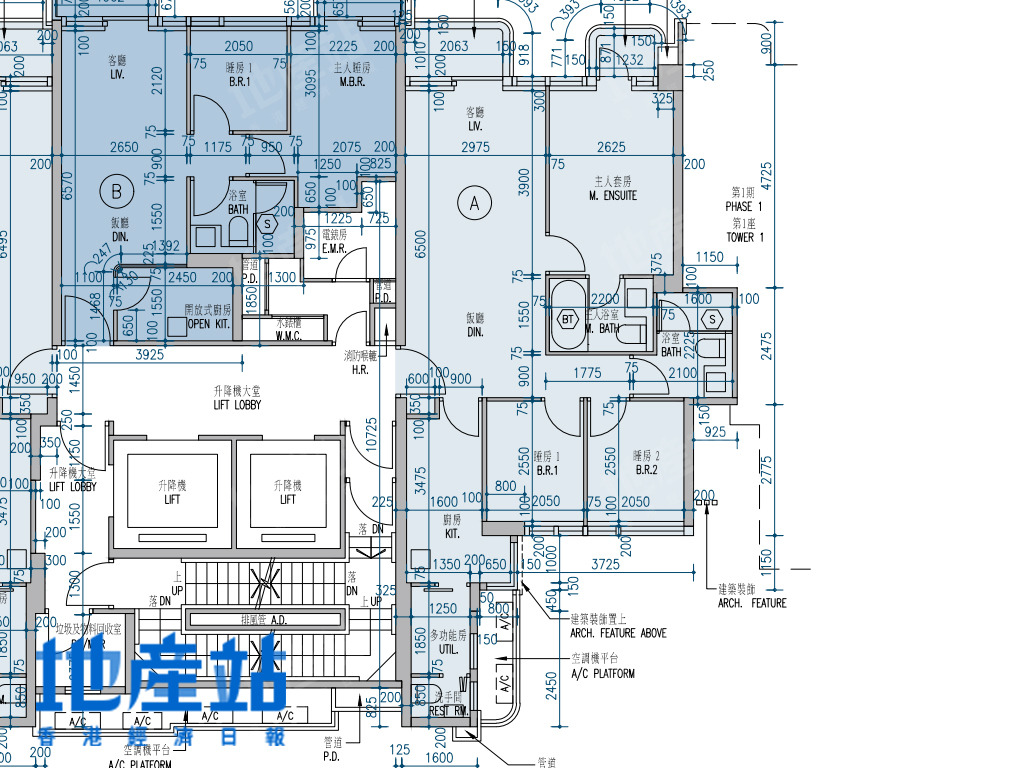 | A室 | 1385 | 4房(連雙套房)及工作間連廁 | 東南偏南方+西北偏北方 |