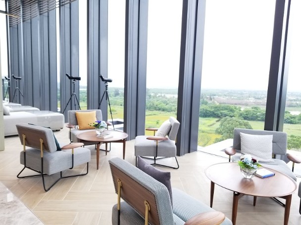 其中項目現樓其中一個兩房單位實用面積423方呎,廚房屬開放式設計,單位內預設無線充電裝置。高層特色四房連一套房及儲物房間隔單位,實用面積892方呎,廚房另設工作間及洗手間,客廳外連實用面積422方呎平台,並採用落地玻璃連趟摺門設計,而室外亦設有私家樓梯通往實用面積504方呎天台,供住戶飽覽濕地公園景致。