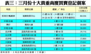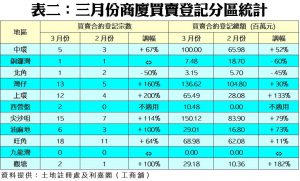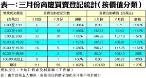 不過,在缺乏5,000萬元或以上的大銀碼商廈交投下,導致三月份商廈買賣登記金額升幅遠不及登記量,只錄約11.02億元,按月只升20%,登記金額仍為近6個月次少。此外,三月份最矚目的單一登記項目為香港仔裕輝商業中心涉及數個樓層的多個單位,涉及合約金額8,003.6萬元;其次為中環己連拿利1號4樓01室,涉及登記金額達3,670萬元。