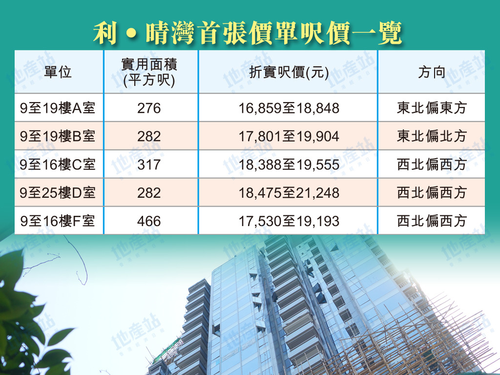 香港樓市呎價2萬成常態下,利‧晴灣23雖然市區新盤,但仍有不少單位折實呎價平過2萬元,首張價單50伙有43伙單位平過2萬。呎價2萬或以上單位暫時見於於18樓以上的282平方呎D室單位,當中25樓折實呎價21,248元,相信除了反映中層以上因素外,相信亦與D室位置剛好在奧柏‧御峯之間,不受遮擋有關。