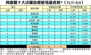利嘉閣地產董事陳大偉表示,大圍站新盤「柏傲莊III」熱賣,吸引大批投資者以及用家入市,凍結部分二手購買力。加上二手屋苑樓價持續上升,平盤已經所剩無幾,準買家態度轉趨觀望,故近日交投量未見有突破。綜合利嘉閣地產分行數據所得,全港十大活躍指標屋苑在上周(31/5–6/6)錄76宗買賣個案,較前周(24/5–30/5)的74宗按周上升3%,平均每個屋苑錄得約7至8宗成交。