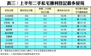 若以屋苑層面分析,日出康城、嘉湖山莊及沙田第一城,分別以386宗、350宗及268宗獲利登記,成為上半年擁有最多私宅轉手賺錢個案的三大屋苑,而各自獲利成功比率分別達98.0%、99.4%及99.3%。至於十大獲利登記最多屋苑之中,以新都城的每宗轉手個案平均賺幅最大,達117.9%,其次為嘉湖山莊的115.9%(詳見表三)。