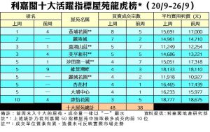 利嘉閣地產董事陳大偉表示,近日本地股市表現疲弱,部分買家打算趁機在二手市場「執平貨」,惟普遍業主仍睇好後市,叫價進取,議價空間有限,令買賣雙方拉鋸情況嚴重。綜合利嘉閣地產分行數據所得,全港十大活躍指標屋苑在上周(20/9–26/9)錄48宗買賣個案,較前周(13/9–19/9)的38宗按周上升26%,平均每個屋苑錄約5宗成交。