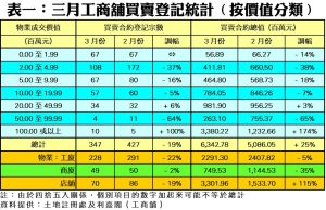 按工商舖三個物業類別劃分,工廈按月登記量持續回落,但仍明顯領放其他兩類物業,按月交投佔比仍達近66%。三月全月工廈共錄得228宗登記,按月減少22%,而月內買賣登記總額跌5%,錄得22.91億元。當中買賣登記量跌幅主要集中在200萬至2,000萬元以內的中細銀碼工廈。反之,1億元或以上的大碼工廈上月錄得逆市上升,登記量按月大升3倍至4宗,並拉動登記金額不致出現顯著跌幅。