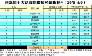 利嘉閣地產董事陳大偉表示,「克制價」新盤熱潮暫歇,有購買力回流二手市場,加上部分業主願意擴大議價空間,促使十大屋苑成交向好。綜合利嘉閣地產分行數據所得,全港十大活躍指標屋苑在上周(29/8–4/9)錄41宗買賣個案,較前周(22/8–28/8)的30宗按周上升37%,每個屋苑平均錄約4宗成交。