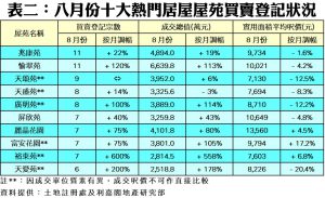 如按屋苑細分(見表二),八月份東涌裕東苑錄7宗買賣,按月大增6倍,而成交總值亦同步飆升近5.6倍至2,814.5萬元。至於屯門兆康苑及沙田愉翠苑,則均各以11宗買賣成為十大熱門居屋榜中交投量最活躍的屋苑。