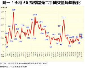 利嘉閣地產董事陳大偉表示,準買家趁加息之際大膽還價,吼實低價上車時機;惟業主相信後市好轉,憧憬通關日子不遠,雙方再度呈現拉鋸,二手屋苑買賣交投量維持窄幅徘徊。綜合利嘉閣地產分行數據所得,全港50個指標屋苑於上周(12/12—18/12)共錄114宗買賣個案,較前周(5/12—11/12)的115宗減少近1%,已連續五周錄逾一百宗水平。