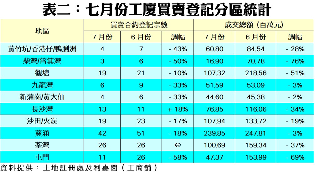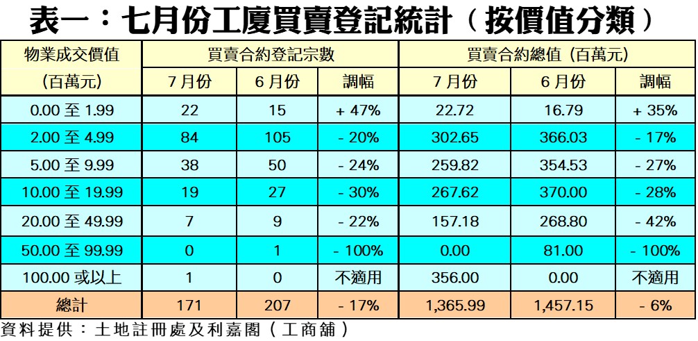 七月工廈買賣171宗 連跌四個月 本月登記稍見明快 冀反彈後穩中向好
