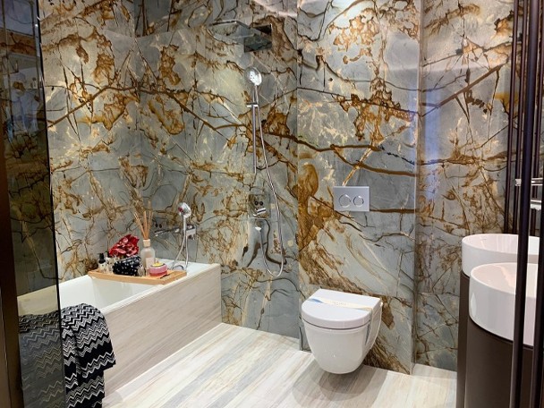 其中一對示範單位參照2座15樓E室搭建,連改動裝修示範單位採用三房連套房及工作間連廁設計,實用面積1,023方呎,整個單位以香檳金作為主調,客飯廳擺放餐枱後仍有充足活動空間,設計師亦將其中一間睡房的牆身打通,擴大空間放置衣帽間及書枱,令主人房空間更寬敞;而同則無改動示範單位間隔呎數相同,大門位置設有玄關,客飯廳涇渭分明。