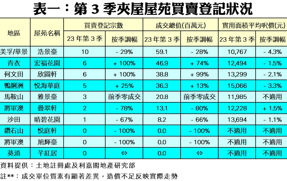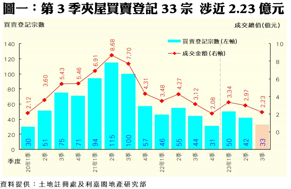 利嘉閣地產研究部主管陳海潮表示,本地銀行於上季跟隨美國聯儲局再度加息,息口高企沖散了年初恢復通關帶來的利好氛圍,樓市走勢再度回軟;另一方面,發展商續以低價推出一手新盤,全面鎖起市場上僅餘的購買力,夾屋交投因此受壓。根據土地註冊處最新資料顯示,第3季夾屋買賣錄33宗登記,成交宗數較第2季減少21%或9宗,連跌兩季;至於期內成交總值錄2.23億元,較前季的2.97億元同步下挫25%,登記量及總值均為近14季(即3年半)次低。