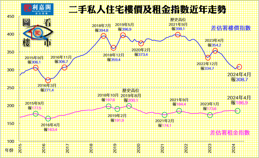 利嘉閣地產研究部主管陳海潮表示,撤辣激起購買力及樓價,惟在新盤低價搶去大量購買力下,二手樓價升幅明顯受限,甚或在缺乏其他利好因素支撐下,或現轉跌情況。差估署今日公布的最新數據顯示,2024年4月份私人住宅售價指數報308.7點,較3月的307.8點再升0.29%,連漲兩個月,惟漲幅有所收窄,樓價已連續兩個月創下今年以來的新高,但首4個月累計,仍跌0.84%;若與2021年9月的歷史高位398.1點比較,樓價累積跌幅持續收窄至22.46%。