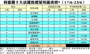利嘉閣地產研究部主管陳海潮表示,市場在對上一周父親節假期短暫休整後,得悉美國有機會於下半年減息兩次,讓市民看見息口下調曙光,重拾入市信心,十大屋苑交投量於低位反彈回升。綜合利嘉閣地產分行數據所得,全港十大活躍指標屋苑在上周(17/6–23/6)錄33宗買賣個案,較前周(10/6–16/6)的17宗增加94%,每個屋苑平均錄約3宗成交。