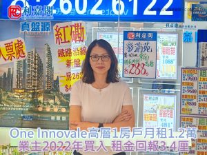 利嘉閣地產上水中心分行首席聯席董事黃靜顏(Yen)表示,該行客戶經理李素紅(Winnie)最新促成粉嶺One Innovale A座高層3室的二手租賃成交個案,單位實用面積約275方呎,屬1房連開放式廚房設計,外望開揚景觀。