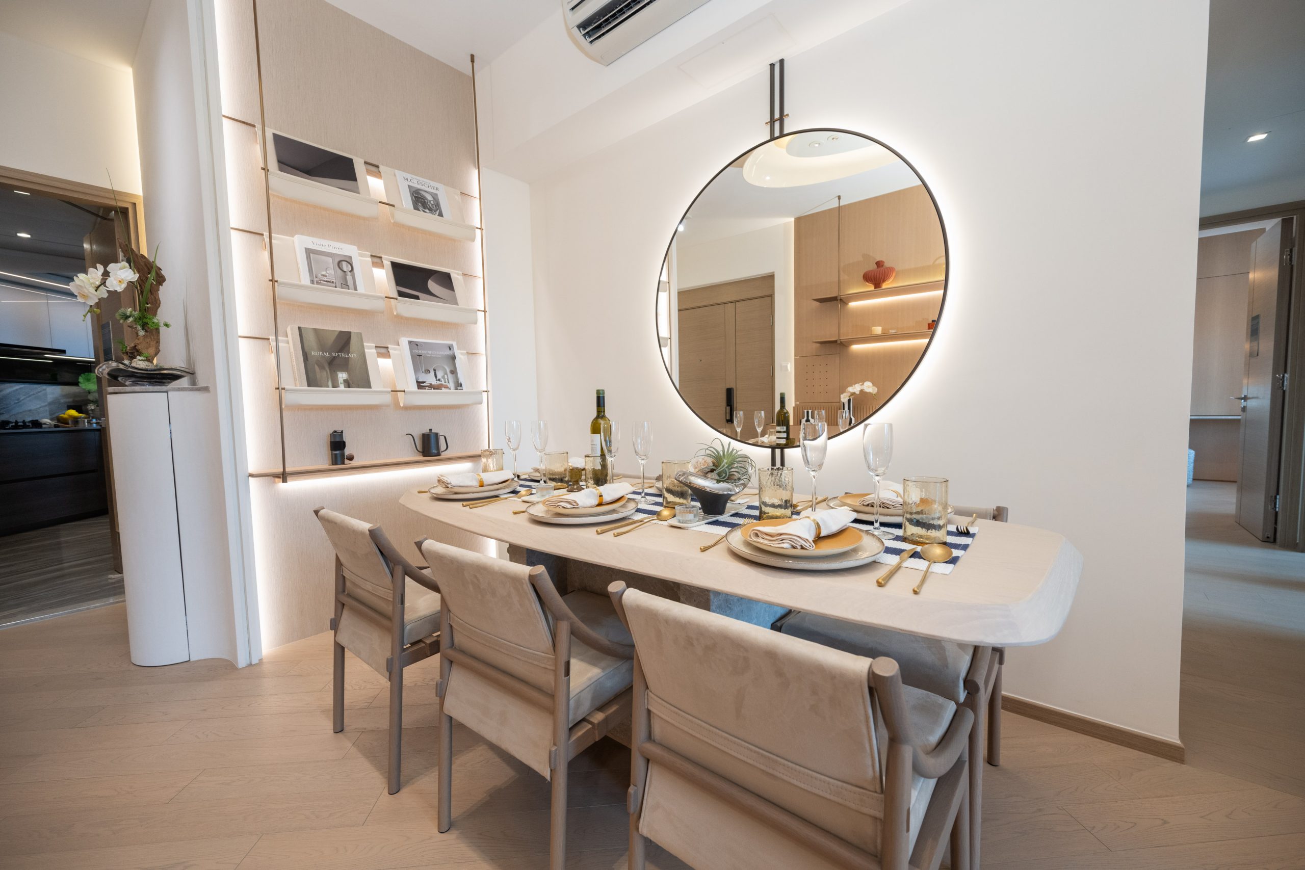 客飯廳整體以色調柔和的大地色系為主題,布局方正實用。地板以淺色複合木地板鋪砌,客飯廳玄關位置特意設計弧形隱藏式置物櫃,讓住戶放置鞋或雨傘,另一側同時放置大型原木置物架,增加收納空間,打造具獨特時尚格調的居住環境。客飯廳左側放置淺色六人長餐桌,桌上放置同色系的餐具以及藍白間條餐桌布,配備灰色絨布的餐桌椅,再以特大圓鏡作配襯,展現自然簡約風格。餐桌左側牆上亦掛上展示架,多座位的設計亦方便住戶日常邀請親朋好友聚餐。客飯廳右側位置放置米色不規則形狀的梳化,配以淺綠色長方形地氈,梳化亦襯上兩個不同花紋的抱枕,前方同樣放置不規則拼色茶几,客飯廳以不規則形狀為整體設計概念,融入多種元素,打造時尚精緻的魅力。牆身亦以立體格紋的設計點綴,增添時髦感。客廳另一端選用特大木展示櫃拼電視櫃,内含壁燈,更顯別緻空間感。客飯廳連接戶外露台,採用落地大玻璃折疊門設計廣納自然光線,大大提高客飯廳採光度之餘,亦延伸室內空間感。