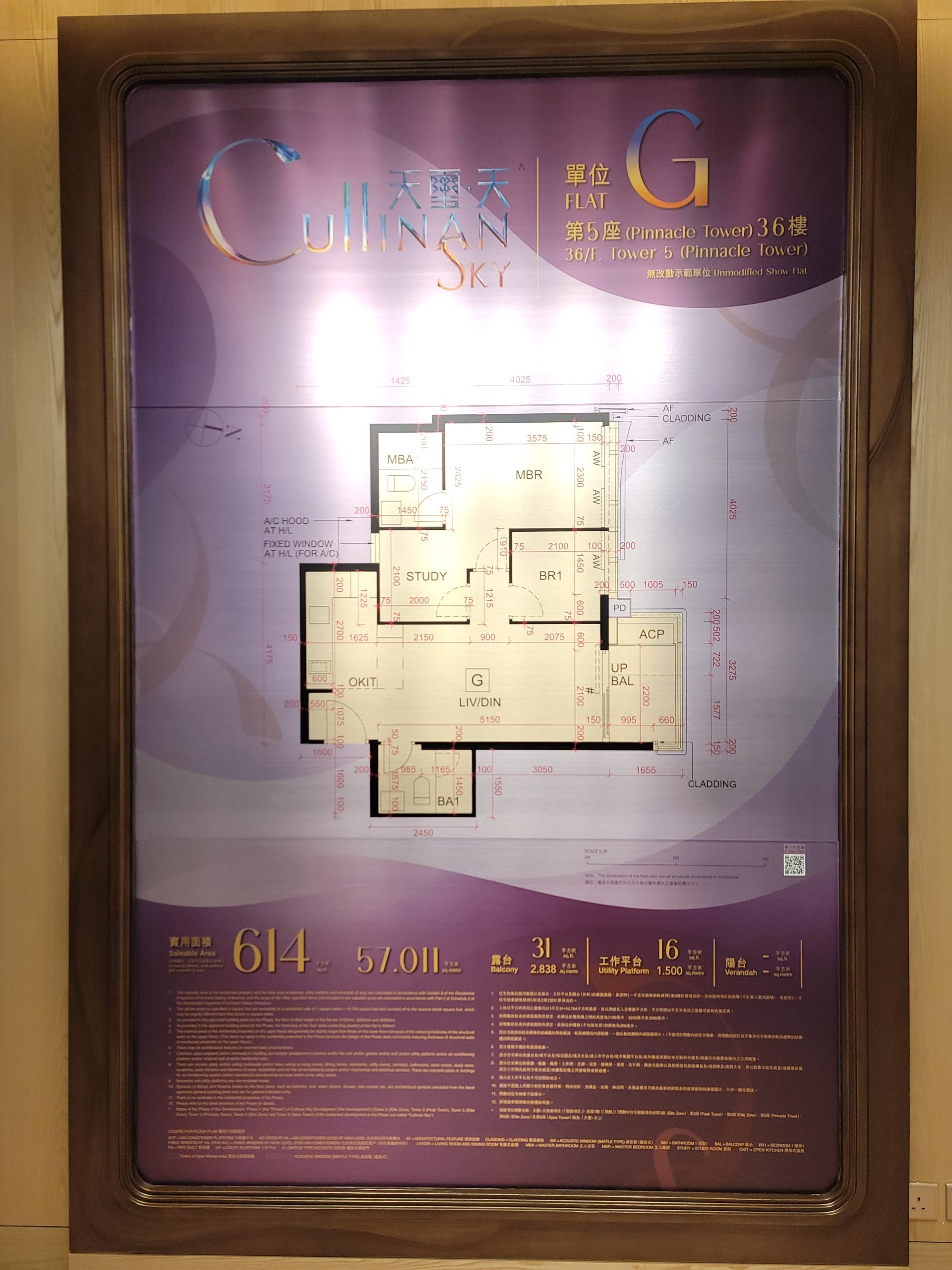 另外,以第5座36樓G室為藍本改造的交樓標準示範單位,實用面積614方呎,兩房間隔。入室左側為開放式廚房,不設有玄關,採深木色儲物櫃,以操作櫃檯隔開客飯廳,側邊設有調料置物架。客飯廳空間諾大,玻璃趟門連接31方呎露台。睡房位於同側,主人房與書房相連,主人房浴室及客廁均為暗廁。