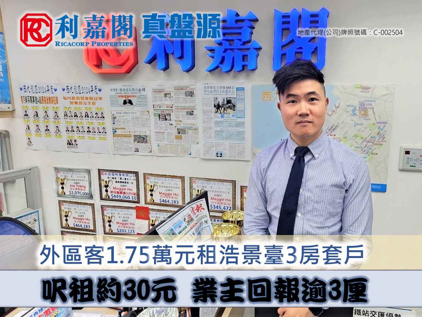 郭氏表示,新租客為外區客,早前經利嘉閣真盤源平台搵樓,經比較過美孚新邨後,當代理介紹上址放盤及睇樓後。客人認為放盤單位環境清靜,景觀開揚,加上間隔四正合用,遂拍板洽租。業主原叫租18,000元,議價後以17,500元成交,折合實用面積呎租約30元。