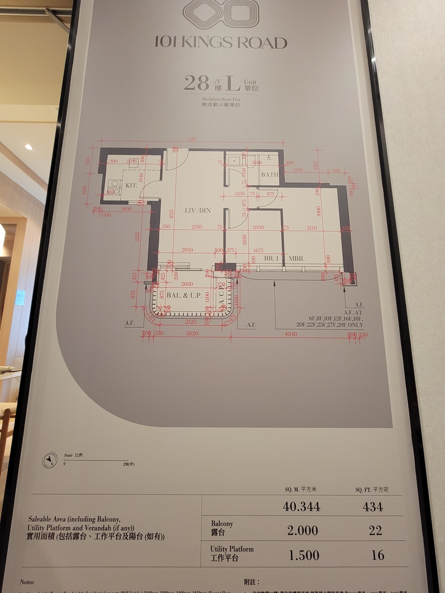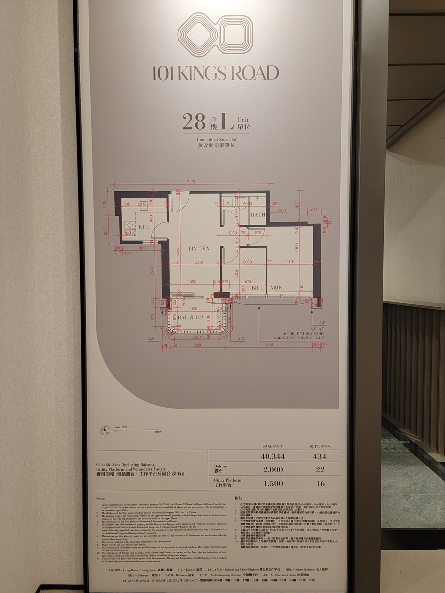 宏安地產北角炮台山新盤「101 KINGS ROAD」提供251伙,實用面積由204至1,291方呎,戶型涵蓋一房至四房。發展商特邀國際知名建築及室內設計事務所Studio PDP主理經改動示範單位,其中28樓L室為藍本而打造的經改動示範單位,兩房間隔,實用面積434方呎,層與層之間的高度最高約3.45米,空間感十足。
