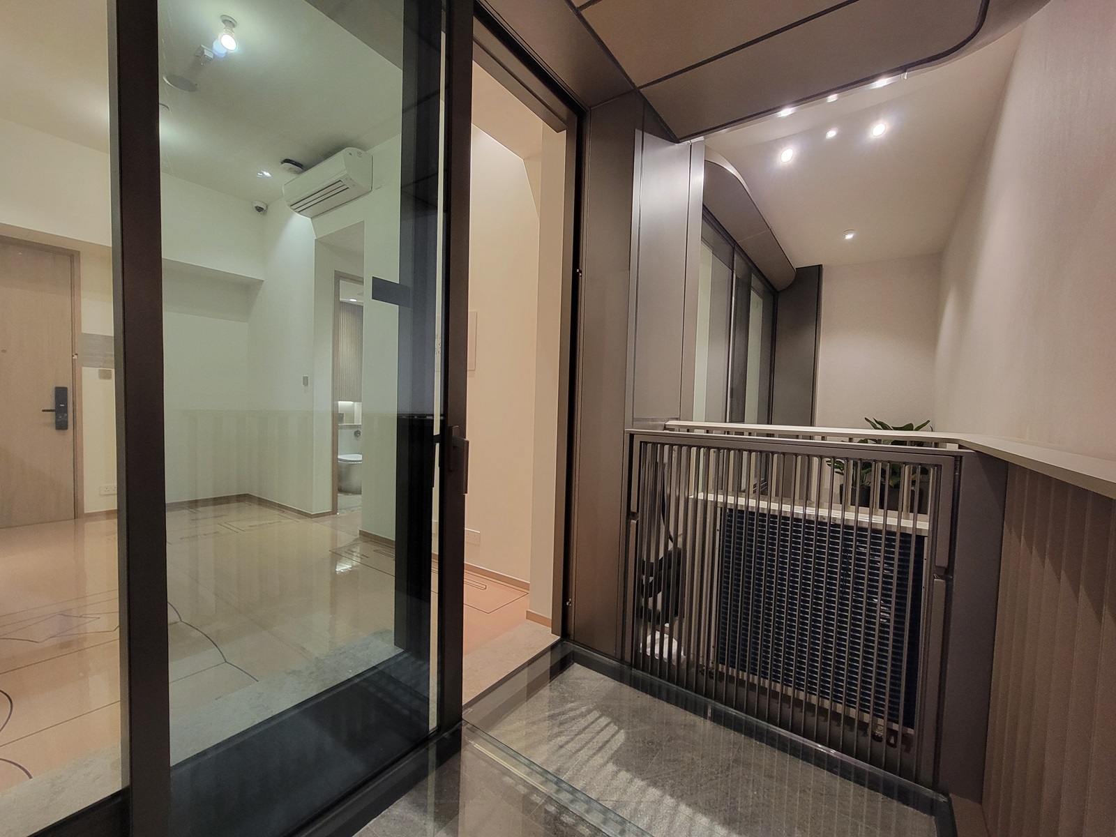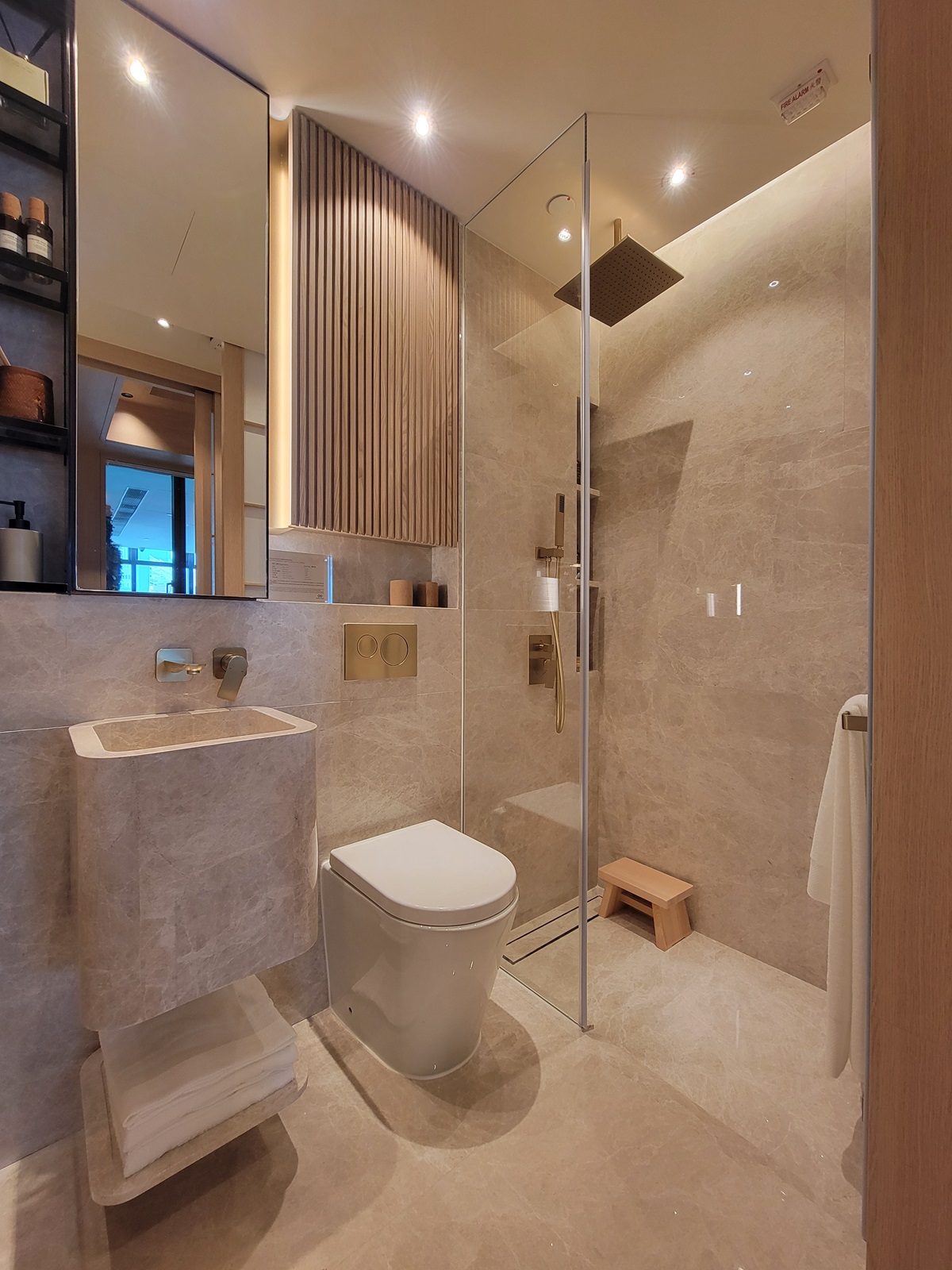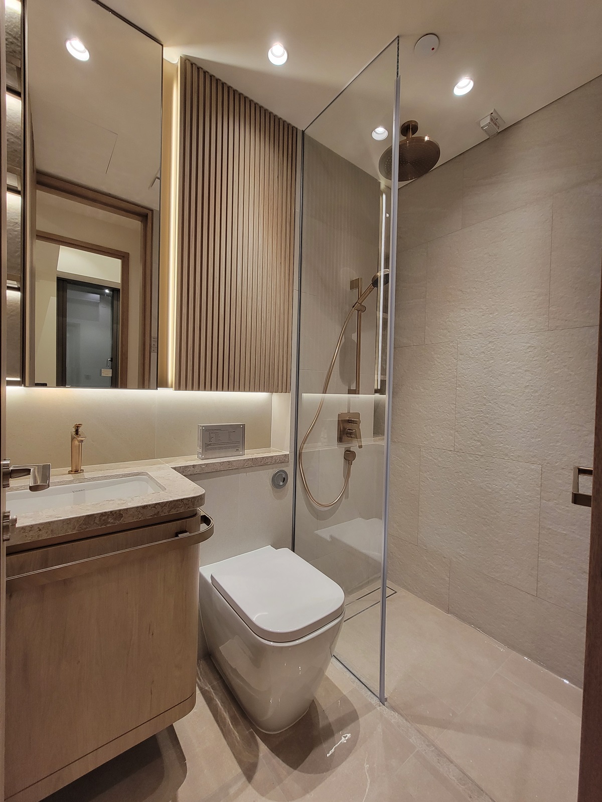 浴室牆身以暖色系為基調,酒店式設計的浴室給戶主提供猶如身處Spa House 的氛圍,鏡櫃和淋浴間的幾何線條展現出優雅的視覺美感,木面飾板突出日式工藝美學的獨特韻味,為住戶營造出恬靜的居住體驗。