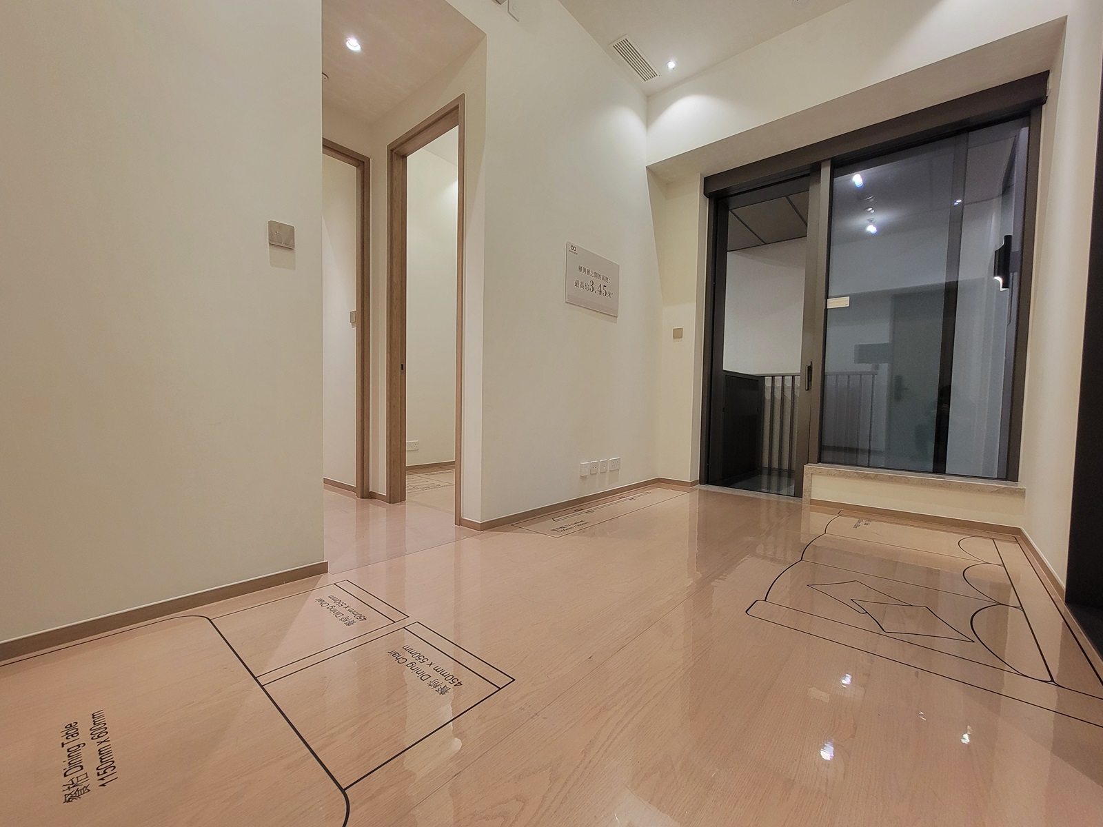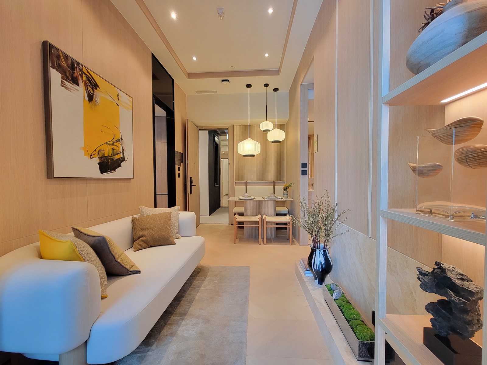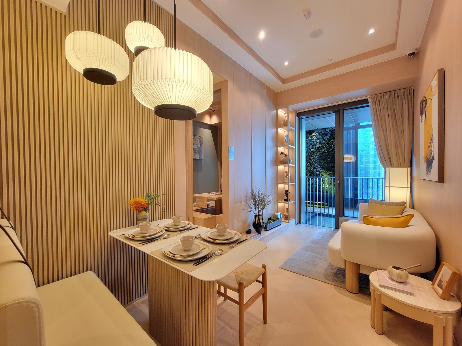 單位進入後,餐桌位置三個不同大小的特色風琴吊燈,柔和光線同時更用餐區增加層次感,4人餐桌使用溫潤的米色調和木質材料。客飯廳用淺色木材為主,增添空間的溫暖舒適感。貼心的空間布局和巧妙的收納設計,使得整體視覺效果既優雅又實用。整體空間採用溫暖的淺色調和大理石質感,營造清新寧靜的氛圍。客飯廳放置3人座位米色梳化,沙發後的木飾面板掛上黃白黑配色藝術畫,為空間增添藝術深度,背牆木飾面板配合雲石電視櫃,整體客廳簡潔舒適,電視機與梳化之間留有充裕空間。