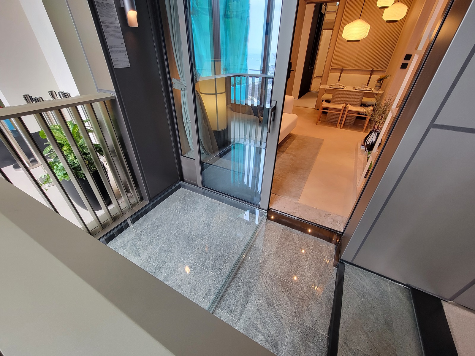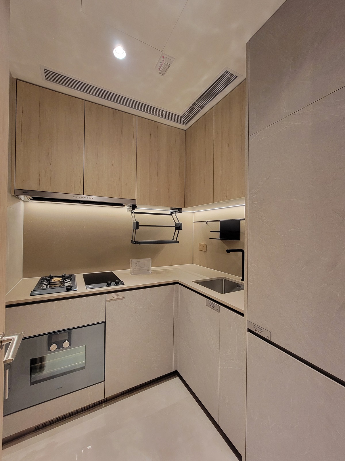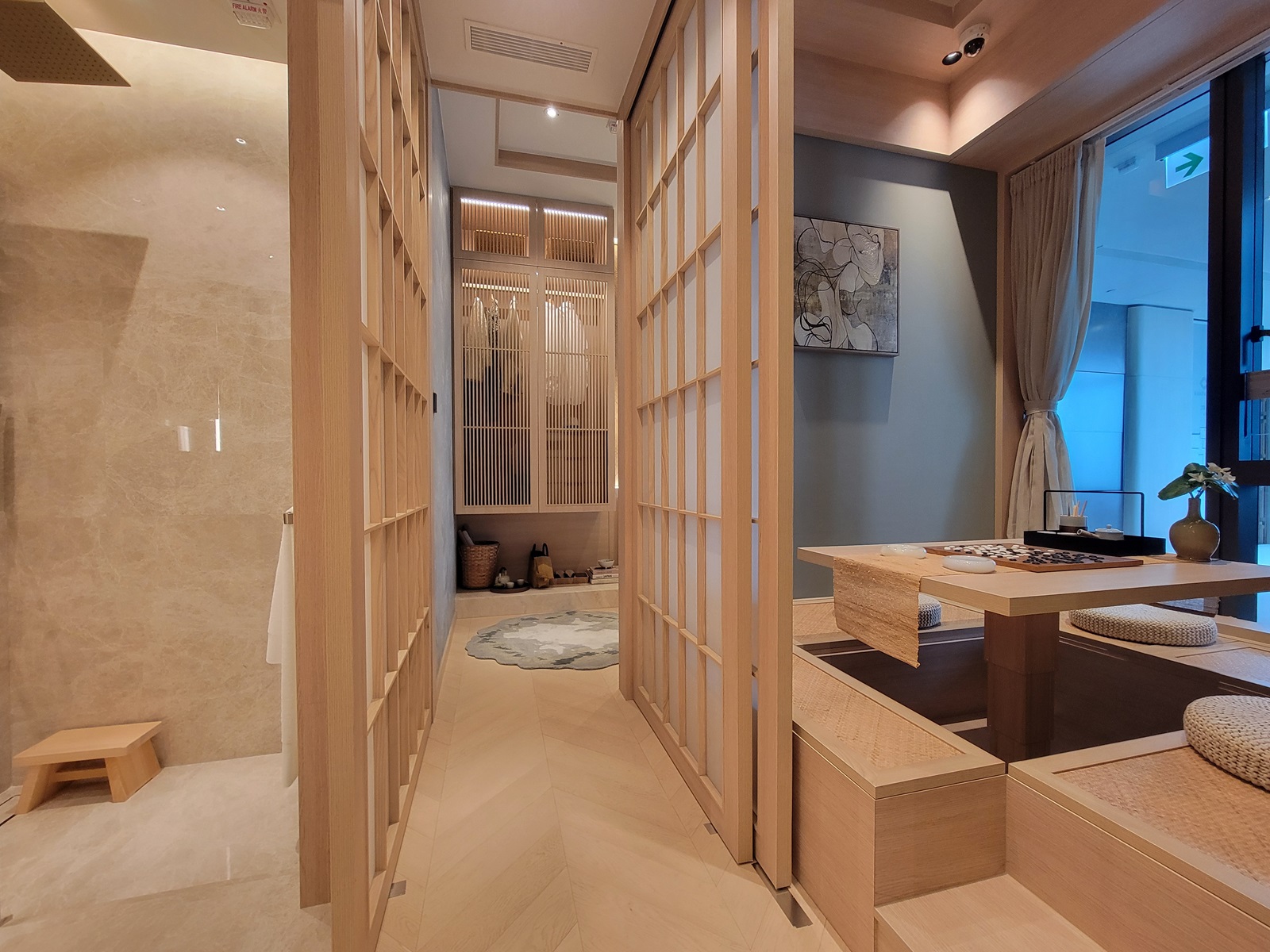 28樓L室經改動示範單位以日式風格作其設計概念,整體以暖色調為主,採用淡雅的米色和木色營造出一種清新素淨的禪意色彩,能給人一種內斂、平靜的感受,大量採用木質和石材配合實用簡約流暢的設計美學,演繹溫馨禪意的室内空間。