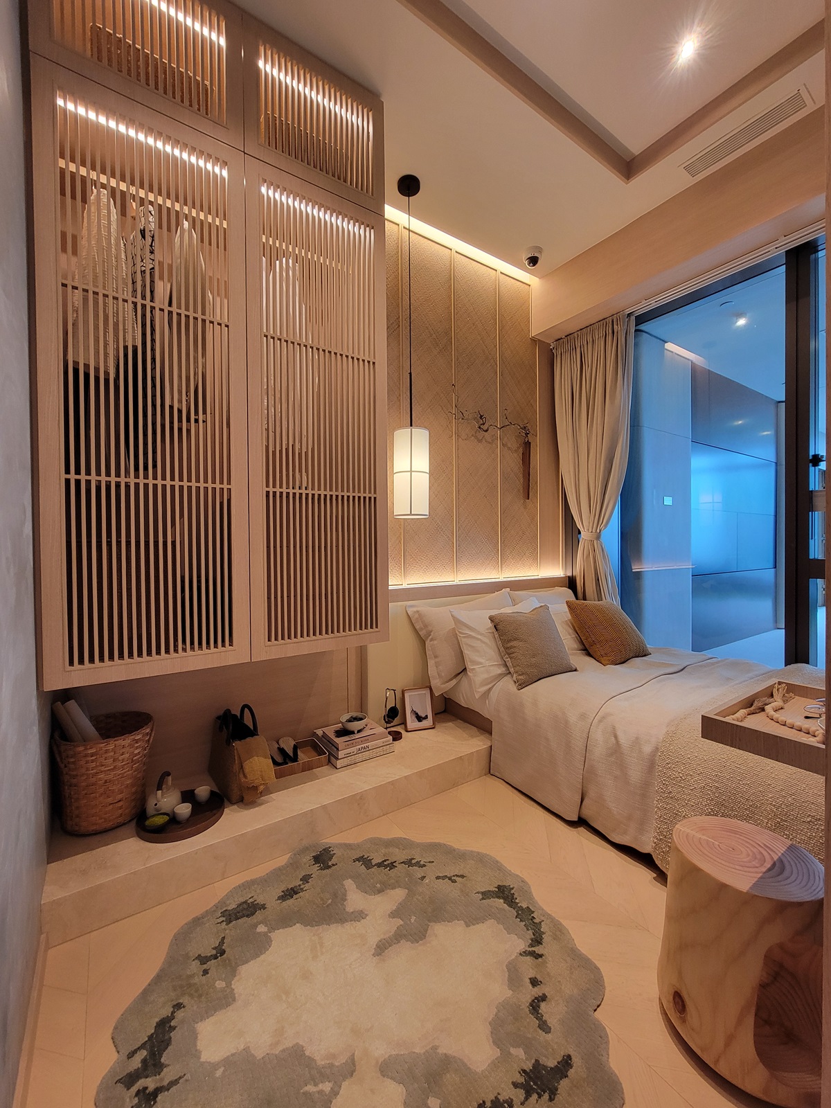 兩個睡房以一字型布局,明亮的落地窗讓充足的自然光灑進室內。主人房雙人床貼近窗戶,為寢區增添休憩空間。地面鋪設圓形地毯。睡床後面用藤草裝飾面板配合飾物,打造溫馨格調日式氛圍,旁邊放置懸空衣櫃充分利用高樓底優勢,内置六格抽屜收納,為住戶提供充足的收納空間。
