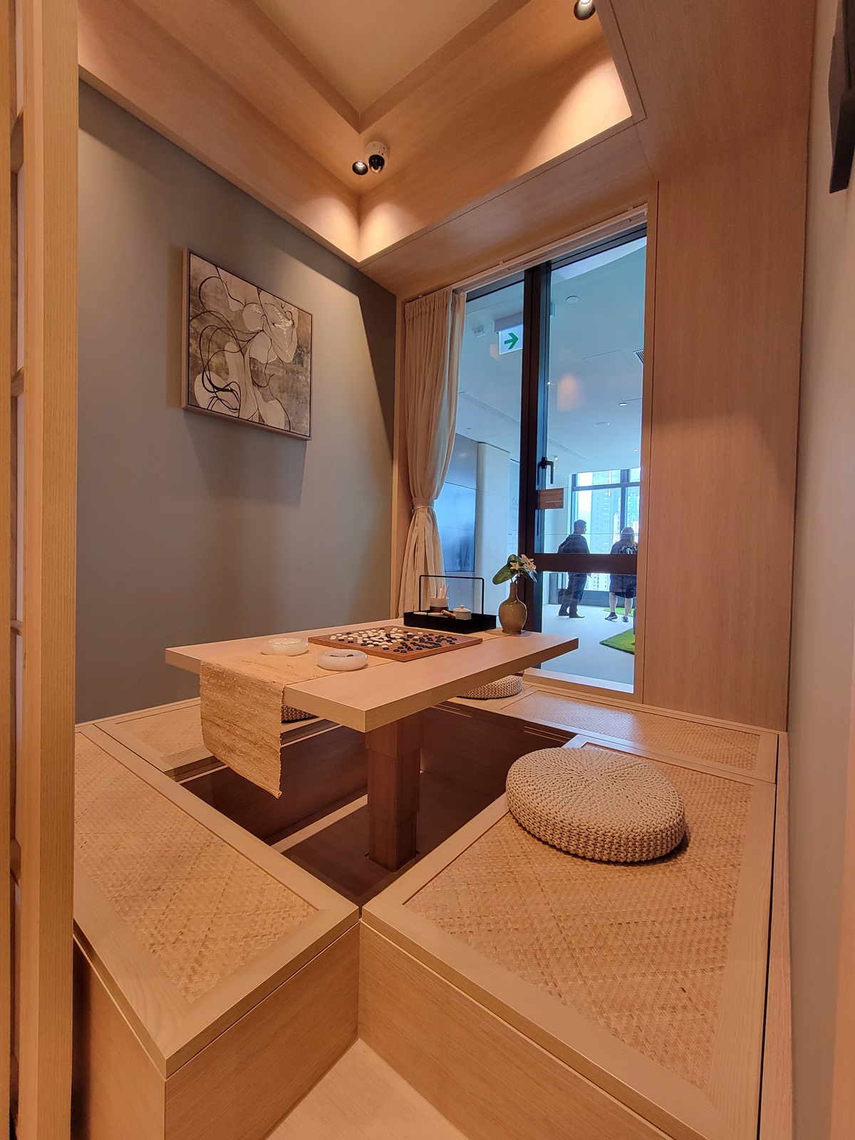 睡房1以榻榻米設計為主題,天花板木飾設計與榻榻米設計互相呼應,提供一個靈活的休閒空間。升降枱提供棋藝休閑空間,使用搖控將升降枱收起後,也能作為客房使用,提供更多活動和儲物的靈活空間。房門經過改造為日式仿紙質趟門提升日式氛圍。