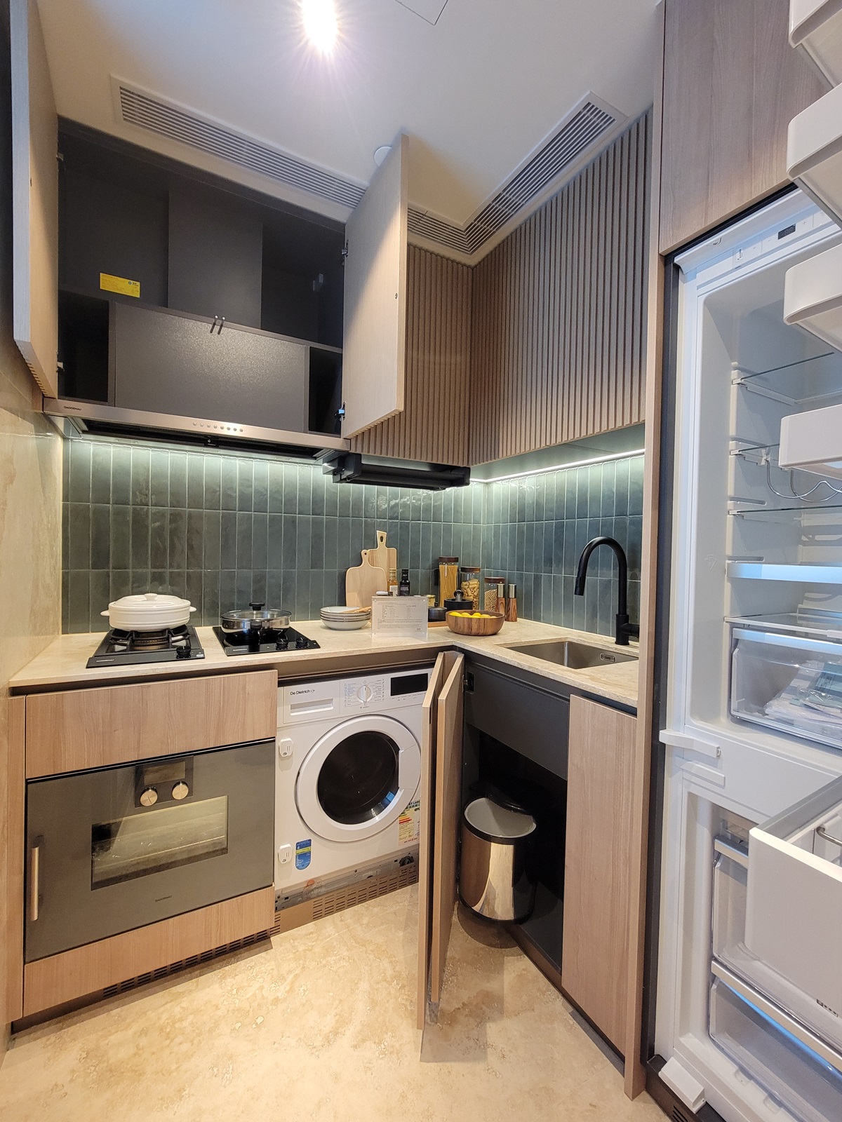 廚房地面和牆面以大理石打造通透感,木飾的收納櫃和牆面湖綠色形成強烈對比。L形工作台面增加實用性,黑色金屬框玻璃霧感玻璃提升空間整體質感。