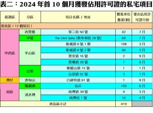 根據資料顯示,十月份本港共有4個私宅項目正式落成,當中規模最大的是啟德承豐道18號,涉及2,060伙;其次為元朗「柏瓏」第1B期及1A期,分別涉及805伙及715伙;至於,大埔公路大埔滘段4138號(135伙),亦於期內竣工(詳見表二)。
