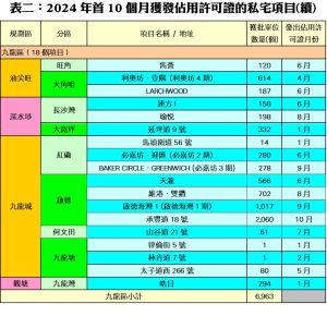 按地區劃分,今年首十個月新界區共有12個項目、合共7,265個單位落成,佔整體比例約49.6%;九龍區共有18個項目落成,涉及單位總數6,963伙,佔同期整體私宅落成量約47.6%;港島區則有12個項目落成,涉及410伙,佔整體私宅落成量約2.8%。