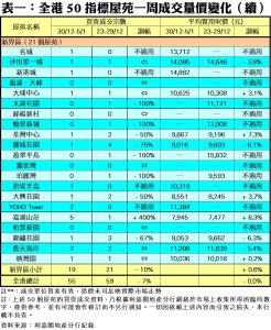 至於,港島區8個指標屋苑上周共錄11宗買賣,與前周的宗數相同,藍籌屋苑太古城期內錄得5宗成交,較前周的7宗減少29%;杏花村交投量由前周的2宗,增加50%至上周的3宗;康怡花園、嘉亨灣及藍灣半島上周則未聞成交,暫時「捧蛋」。此外,在全港50個指標屋苑之中,上周共有17個屋苑錄得「零成交」,較前周的18個減少6%,當中港島區及九龍區分別佔3個及6個屋苑,新界區則佔8個(詳見表一)。