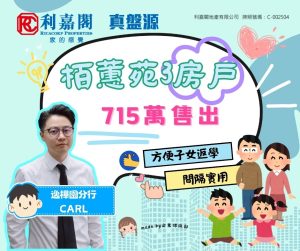 利嘉閣地產逸樺園分行聯席董事吳玉蘭(Hody)稱,該行高級客戶董事謝嘉豪(Carl)新近促成鰂魚涌栢蕙苑祥栢閣低層B室的二手成交個案,單位實用面積約670方呎,採3房間隔,外望開揚內園景。