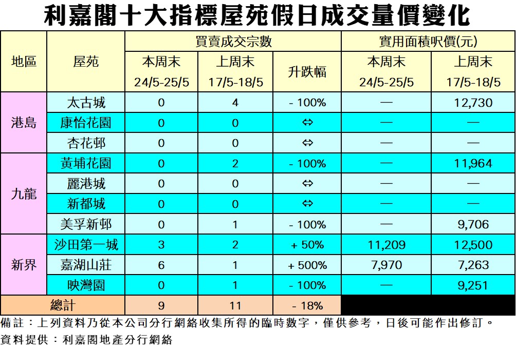 《利嘉閣十大指標屋苑假日二手實況》 新盤搶焦點 周末二手交投回落至單位數 十大屋苑錄9宗成交 按周減少18% 研究報告 2025-05-26 by Chan Derek · Published 2025-05-26